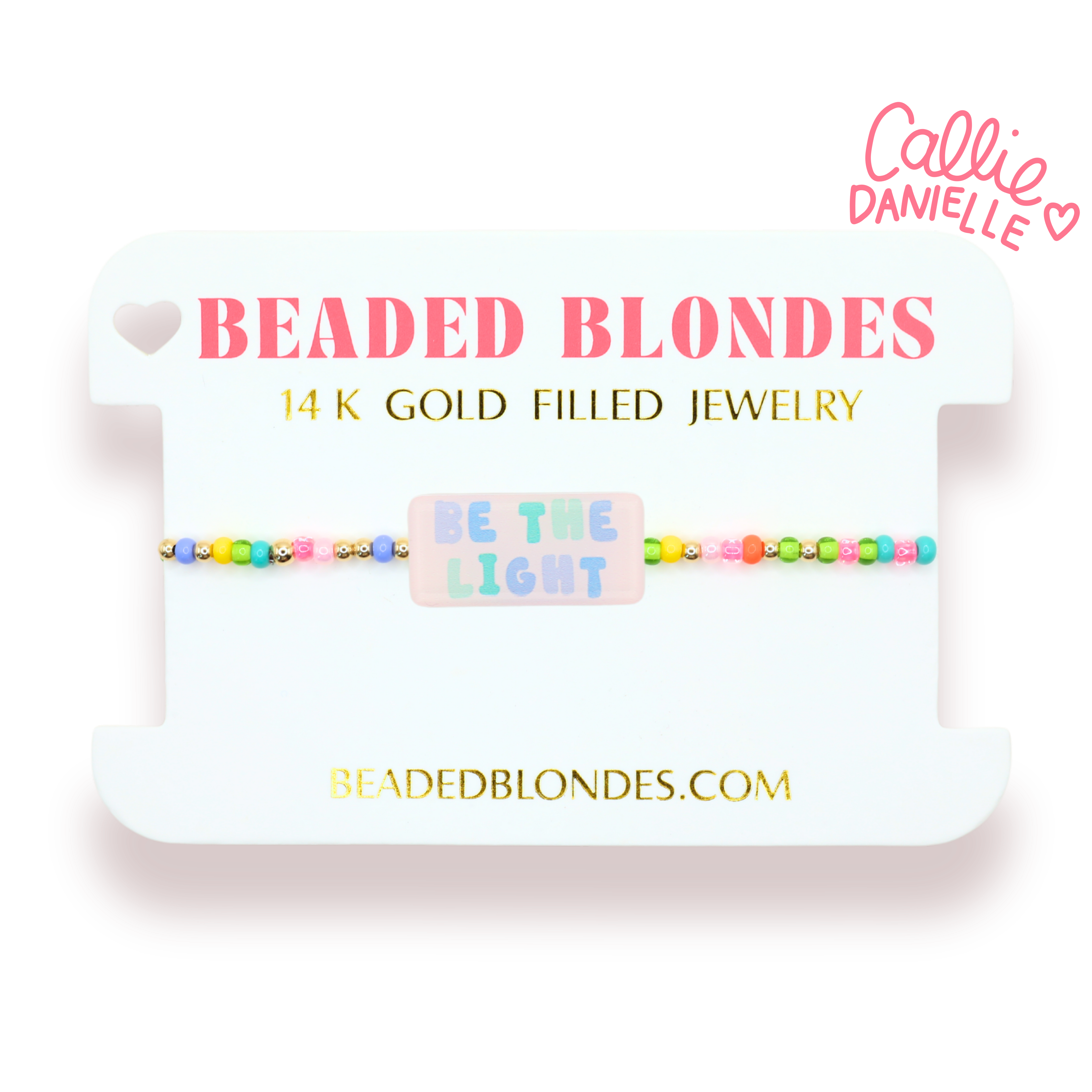Be The Light bracelet is part of the exclusive Beaded Blondes x Callie Danielle collection. Featuring an acrylic bead hand-drawn by Callie herself, it’s a vibrant reminder to spread positivity and sunshine wherever you go. This bracelet is waterproof, beachproof, and sweatproof—making it the perfect accessory for everyday wear!