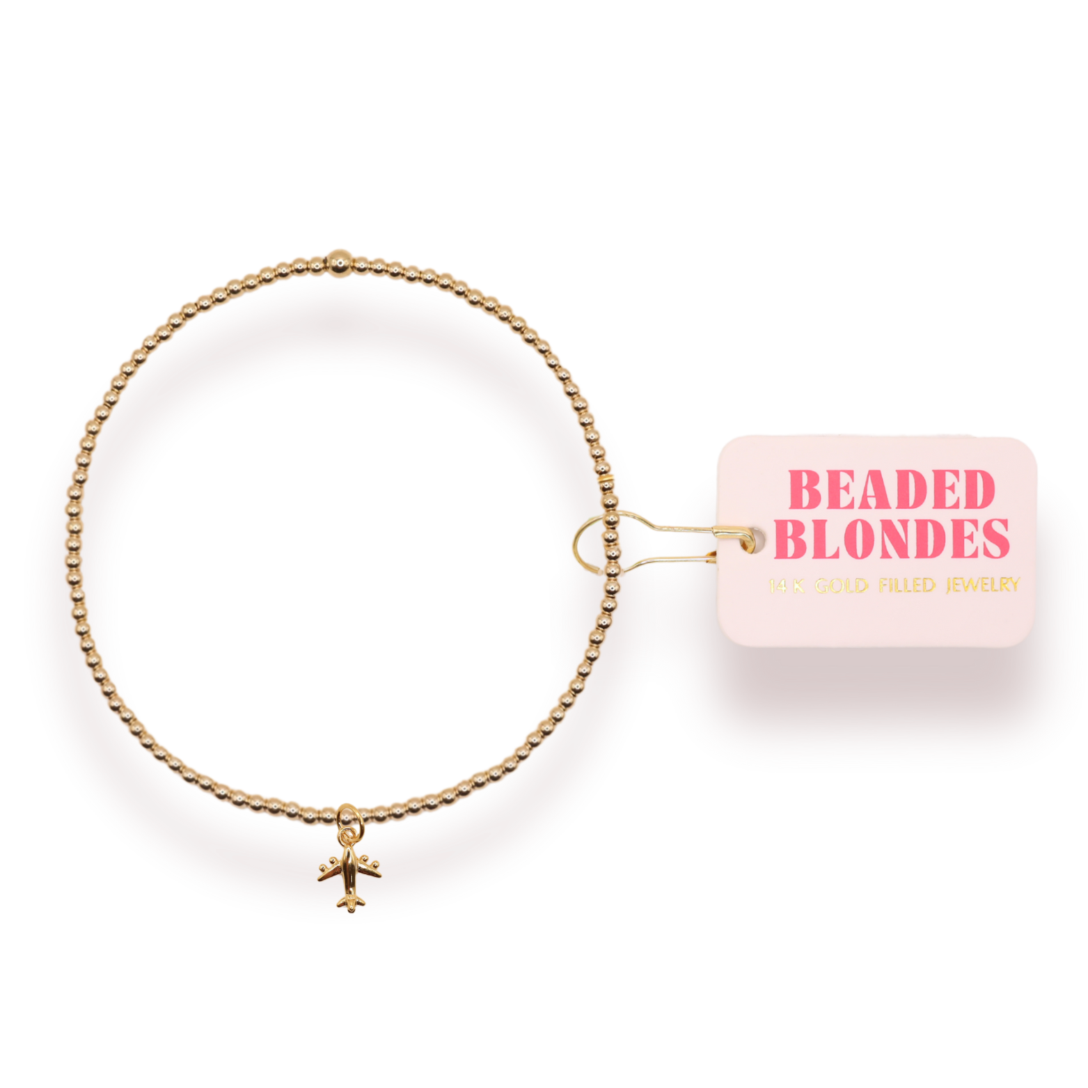 2MM gold beaded stretch bracelet with gold airplane charm.