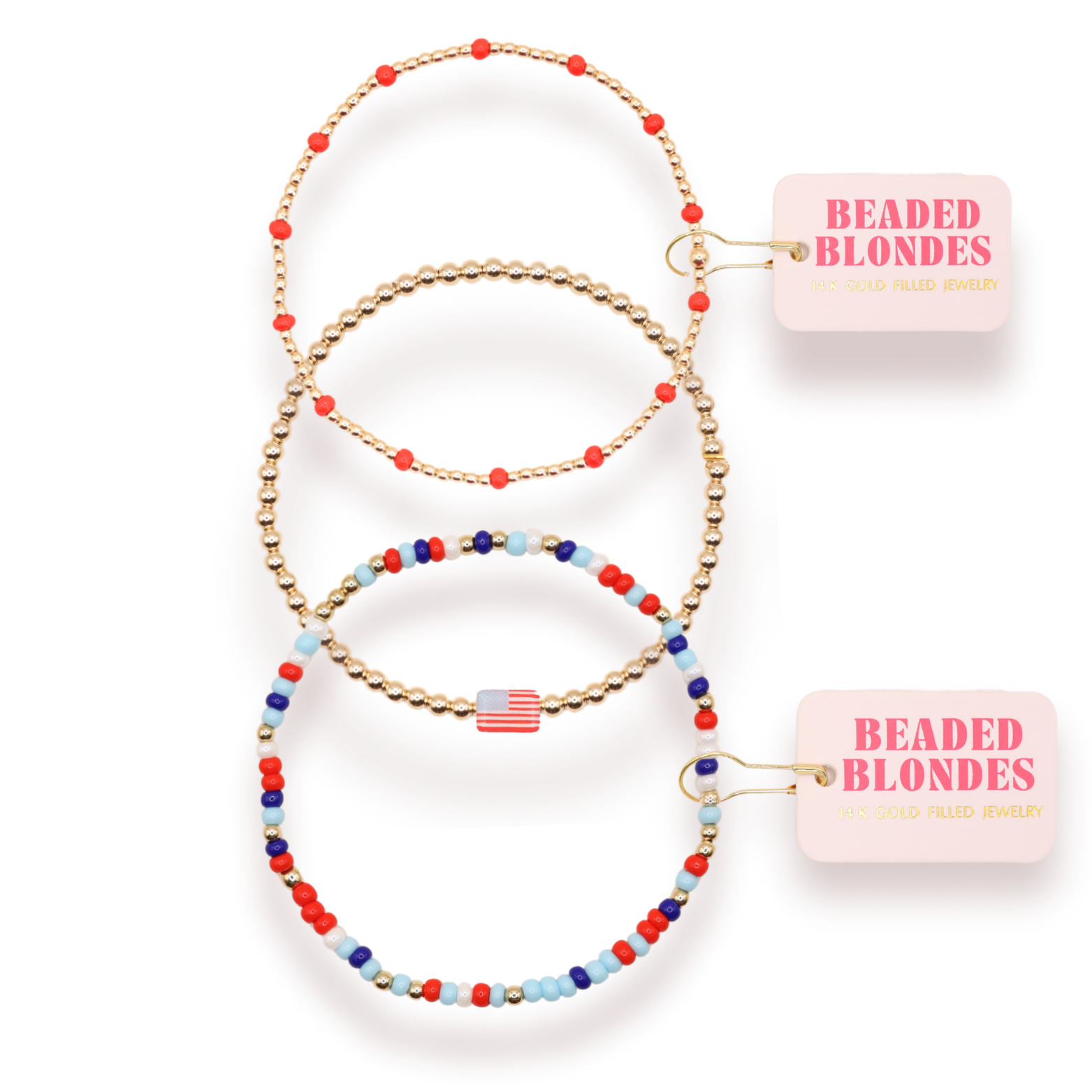 This bracelet stack is perfect for Memorial Day or 4th of July. A custom made bead with festive combination of red, blue and white. Comes in a variety of sizes and each made unique!