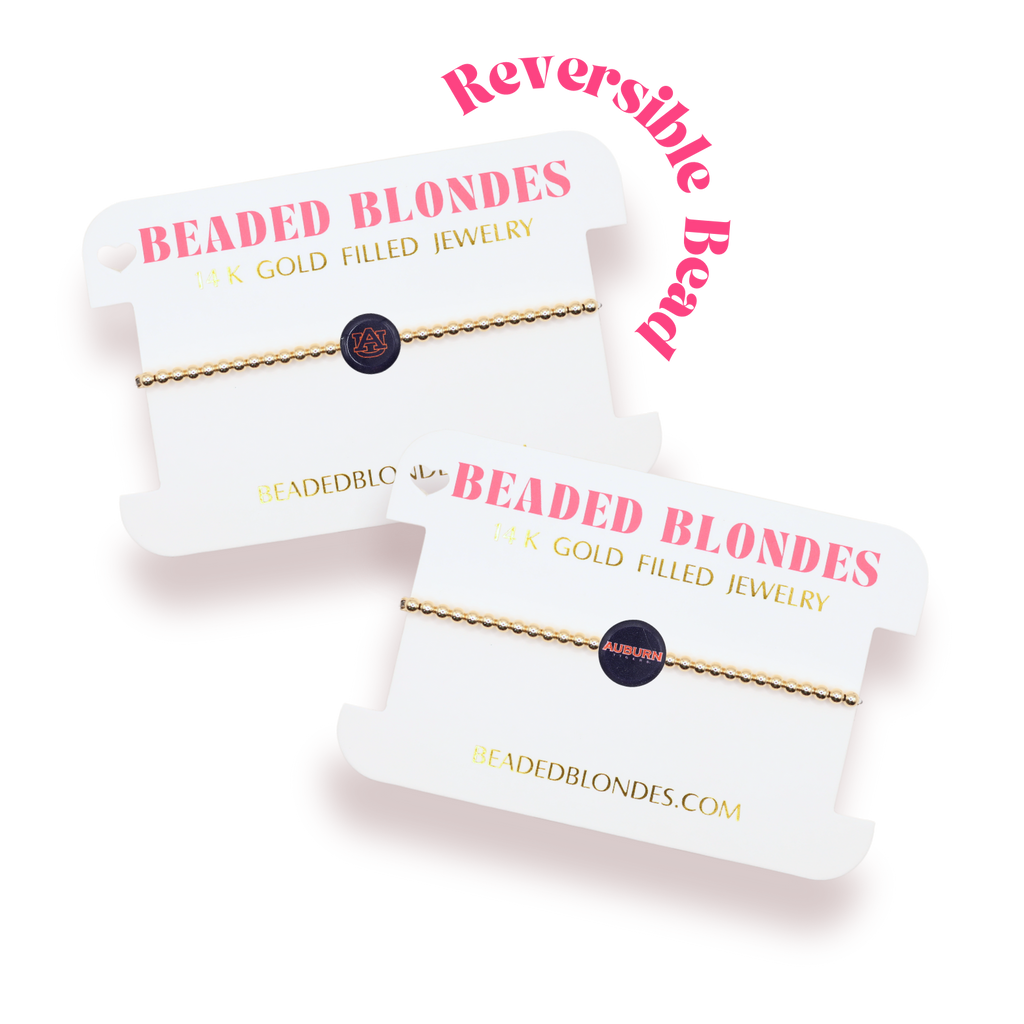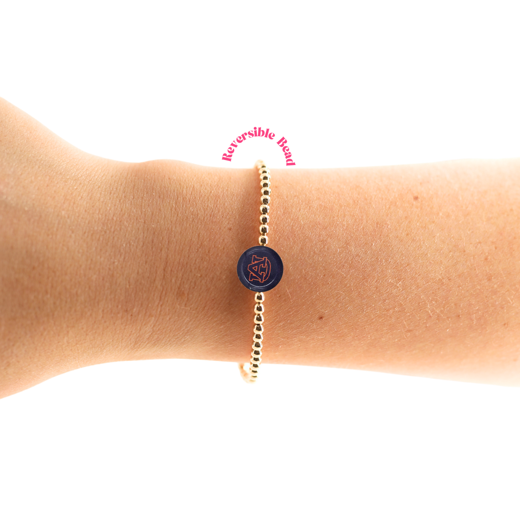 • 3MM gold beaded stretch bracelet with an acrylic bead that will not fade.