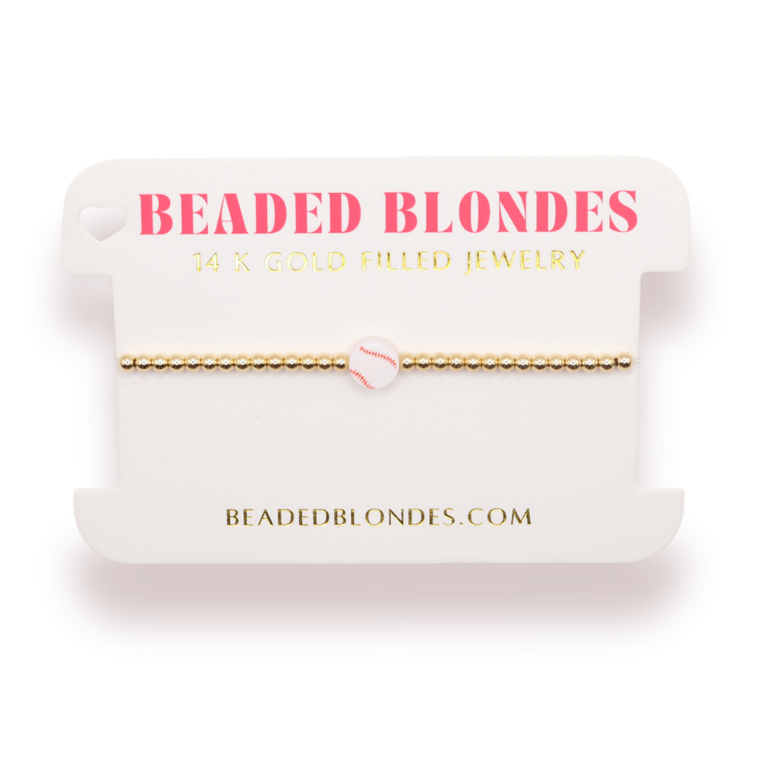 • 3MM gold beaded stretch bracelet with an acrylic bead that will not fade.
