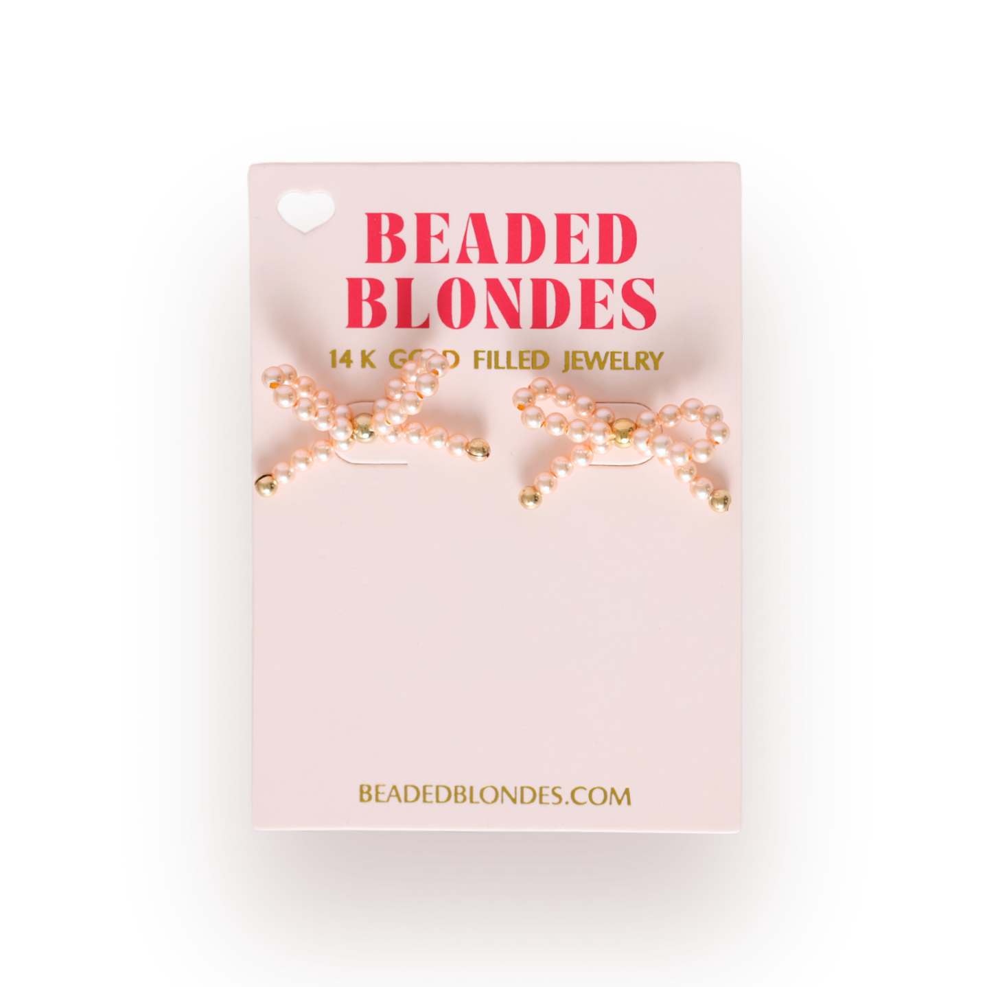 Beaded Blondes best selling bows in pearl beaded earrings.