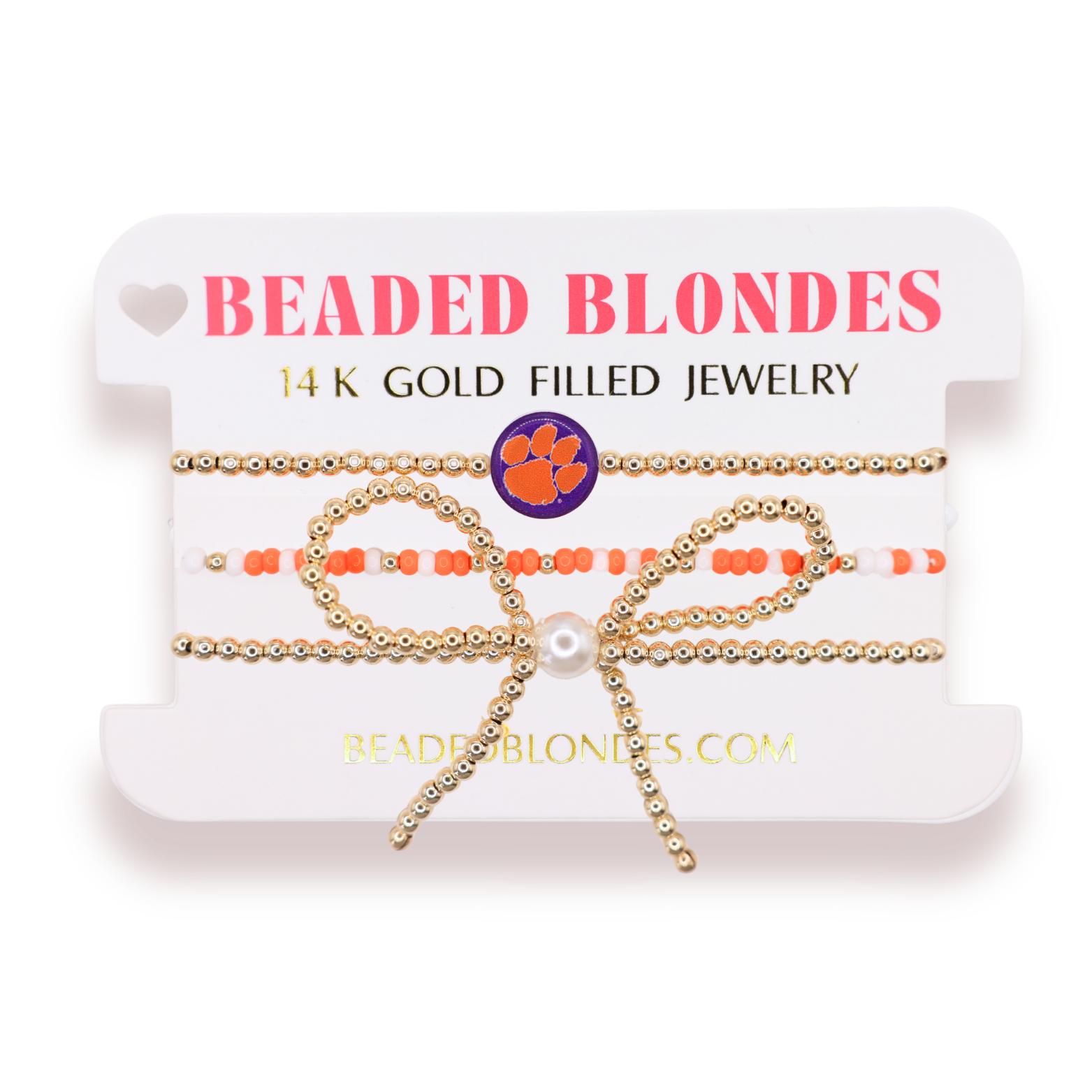 Get ready to support your favorite team in style with our 2 sided CLC Licensed Game day + sprinkle bracelet + best selling bow bracelet stack! Perfect for game day, this bracelet features unique A&M-themed beads.