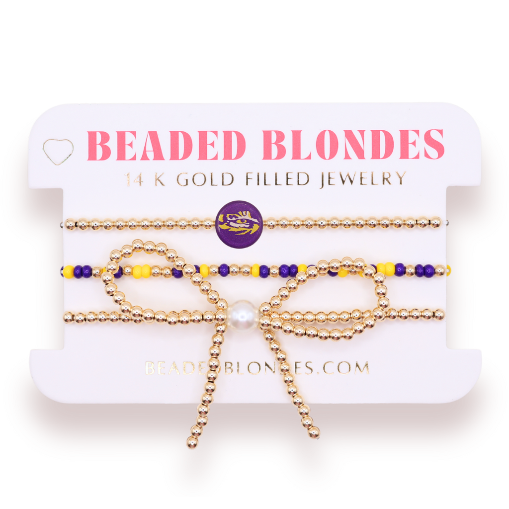 Get ready to support your favorite team in style with our 2 sided CLC Licensed Game day + sprinkle bracelet + best selling bow bracelet stack! Perfect for game day, this bracelet features unique A&M-themed beads.
