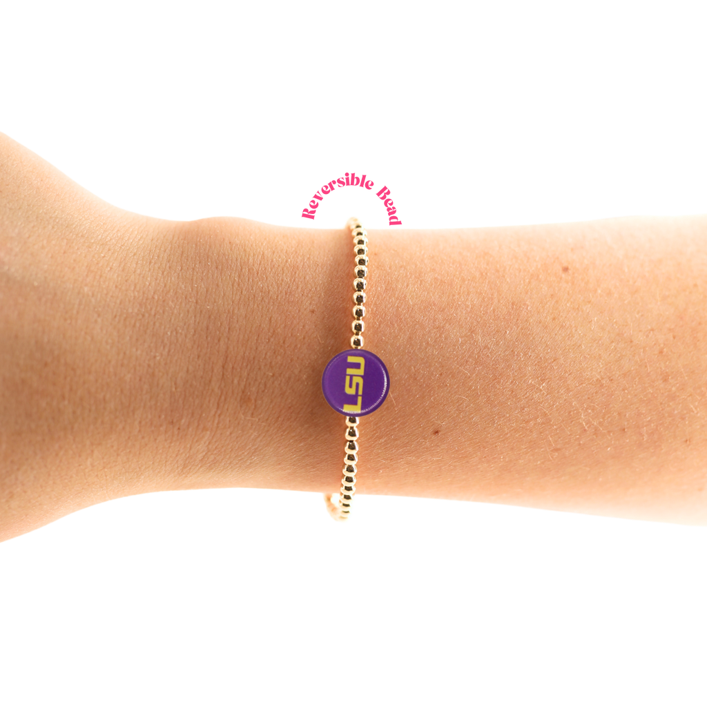 • 3MM gold beaded stretch bracelet with an acrylic bead that will not fade.