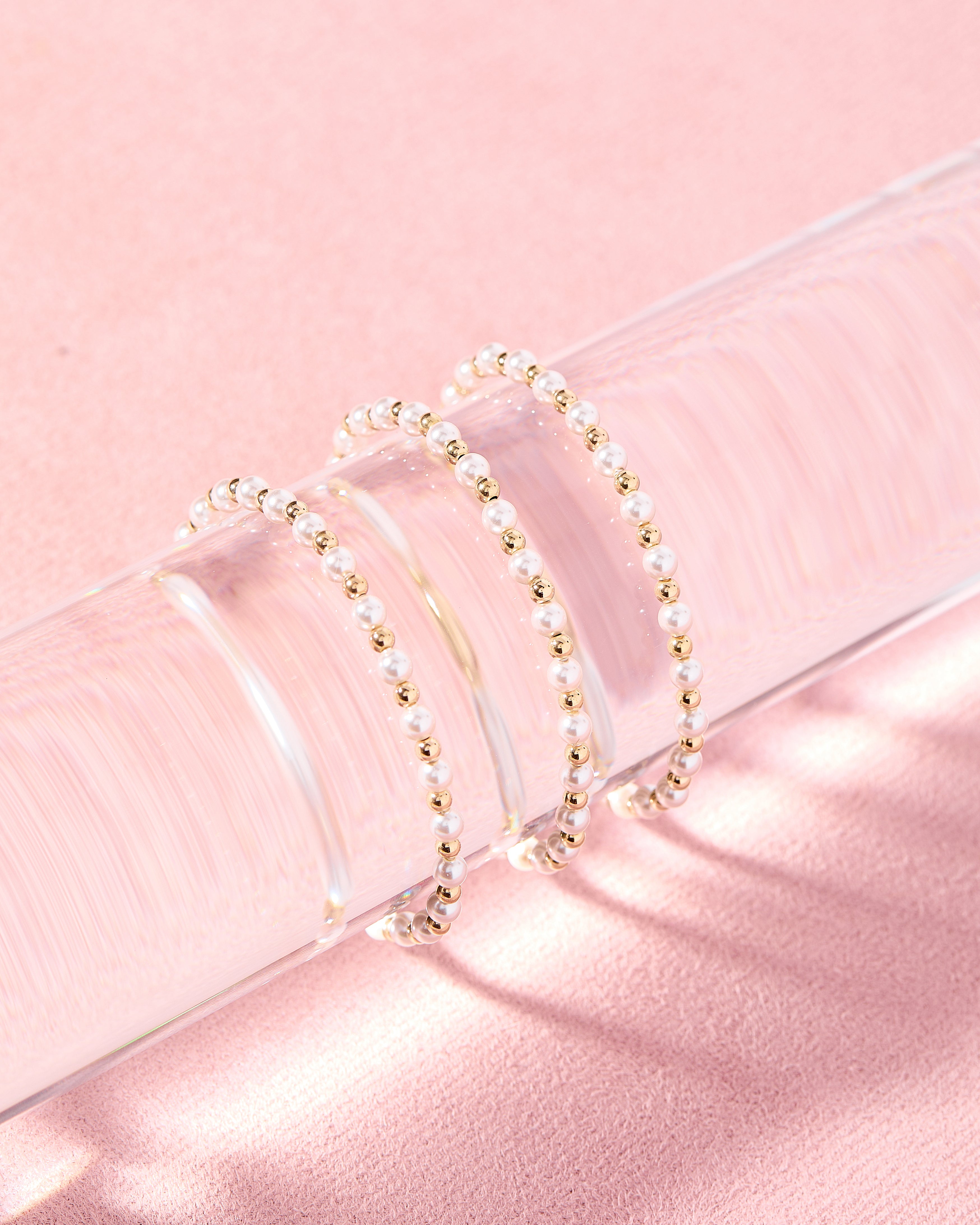 The Luci bracelet is 3mm beads + synthetic pearls.
