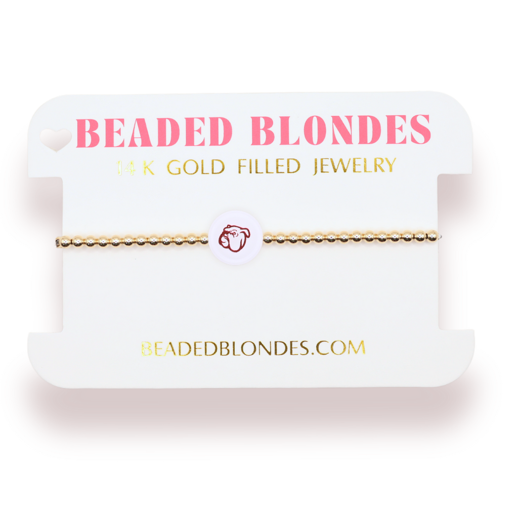 • 3MM gold beaded stretch bracelet with an acrylic bead that will not fade.
