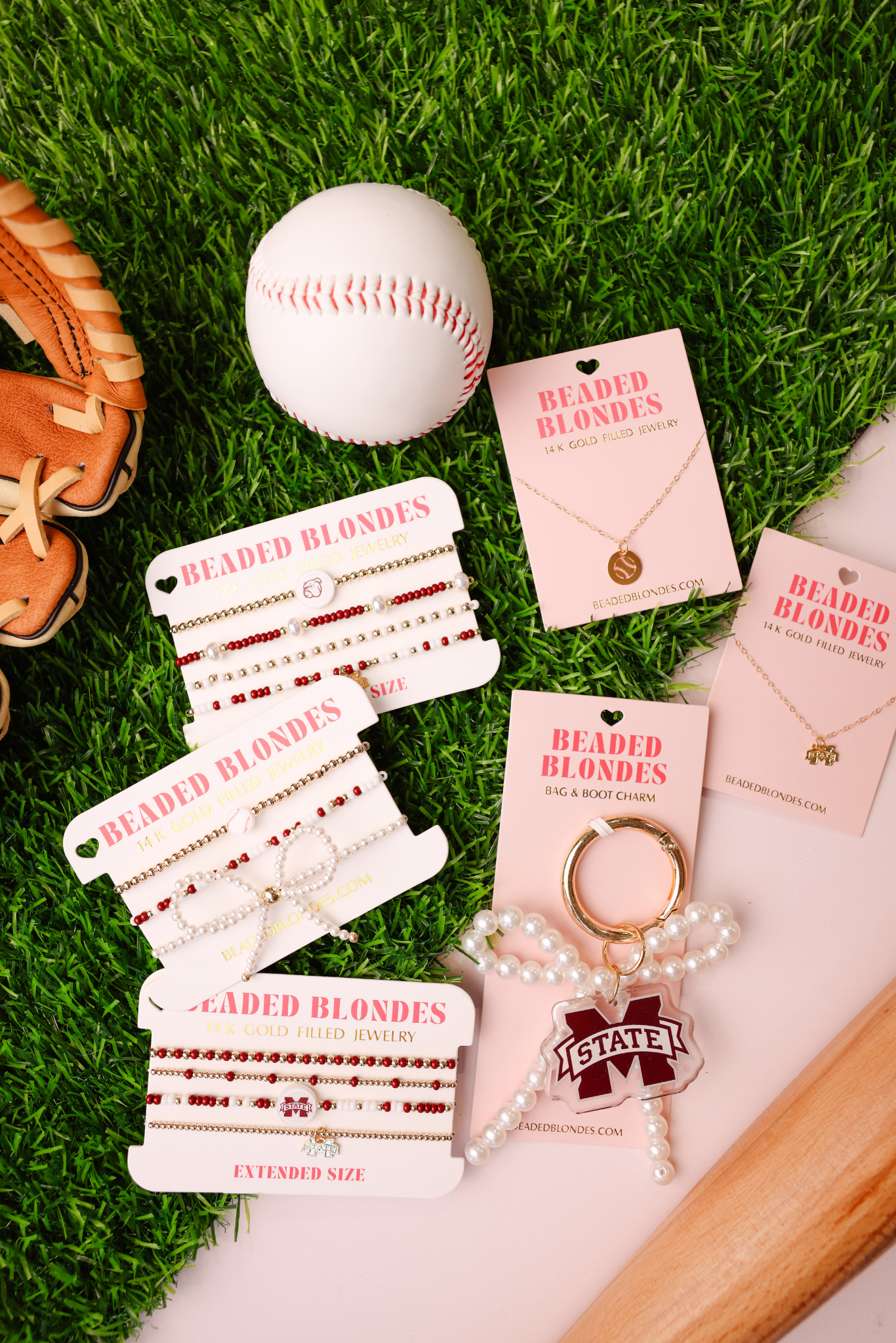 Dress up your bag or boot with this Mississippi State logo charm + our iconic pearl bow