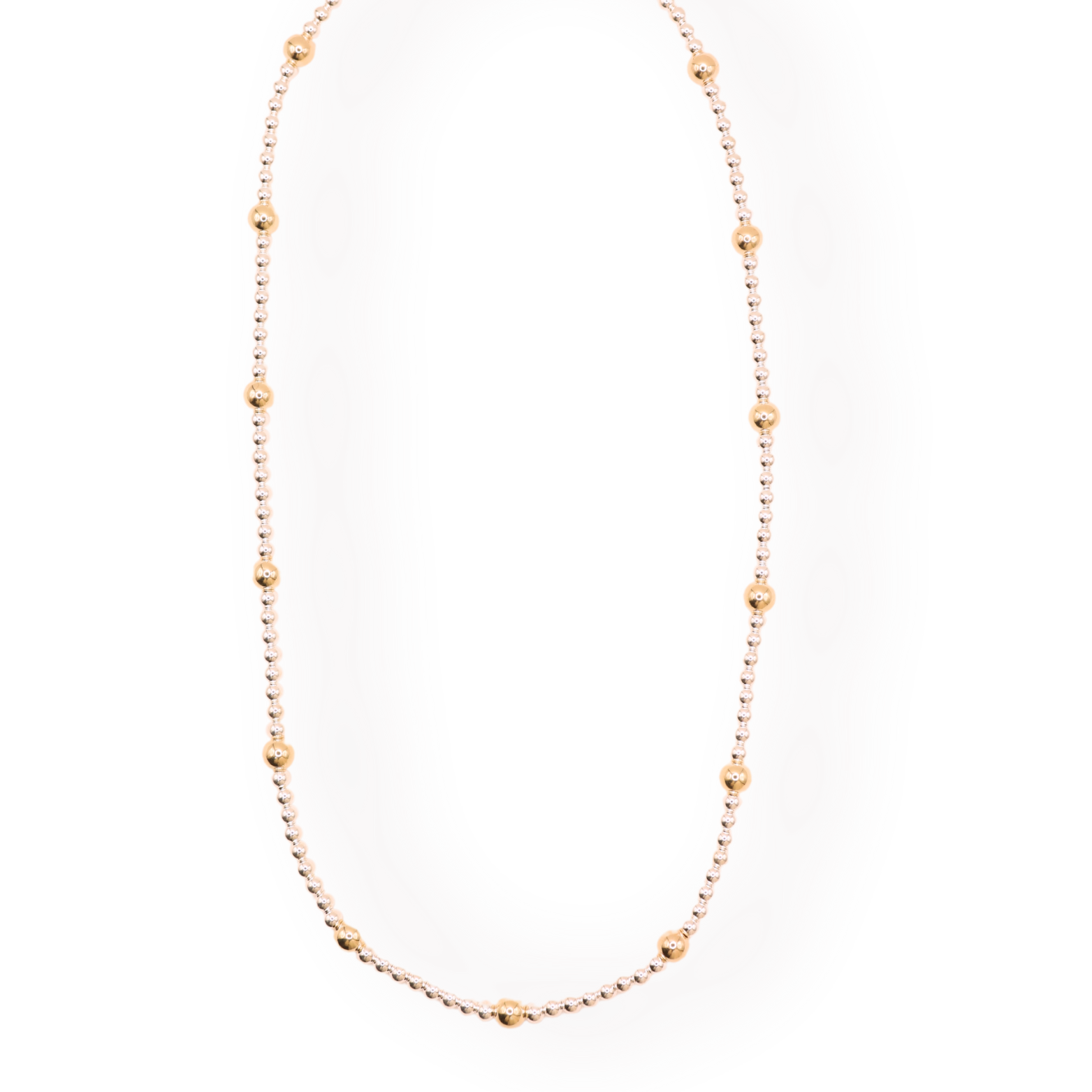 This is a mix of our 3MM sterling silver beads and 5MM 14 K gold filled beads making the perfect necklace. No clasp the durable elastic allows you to stretch it right over your head.