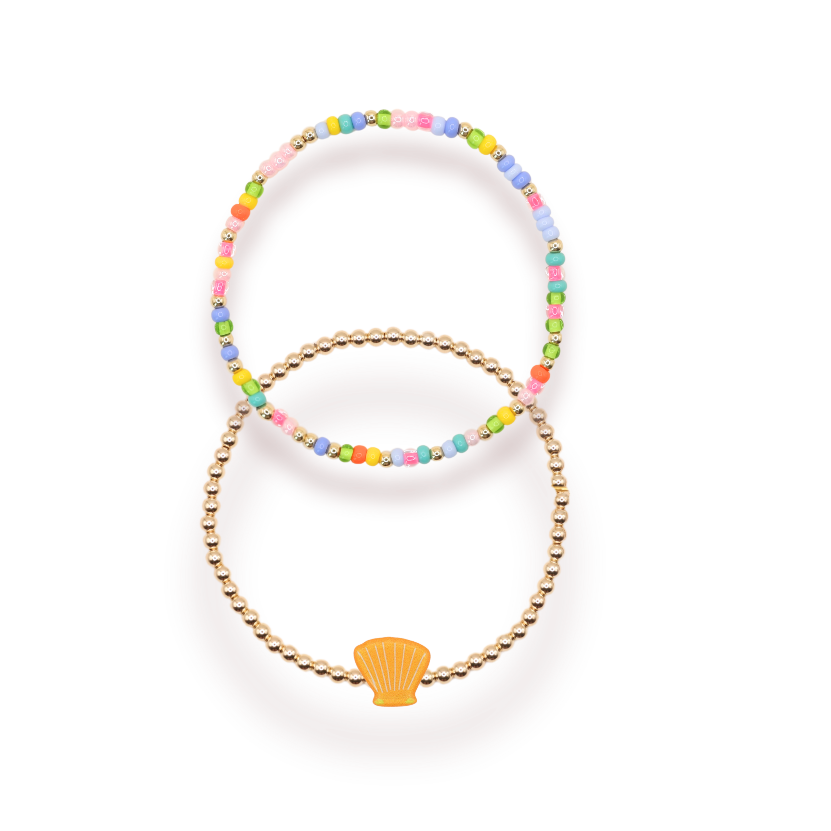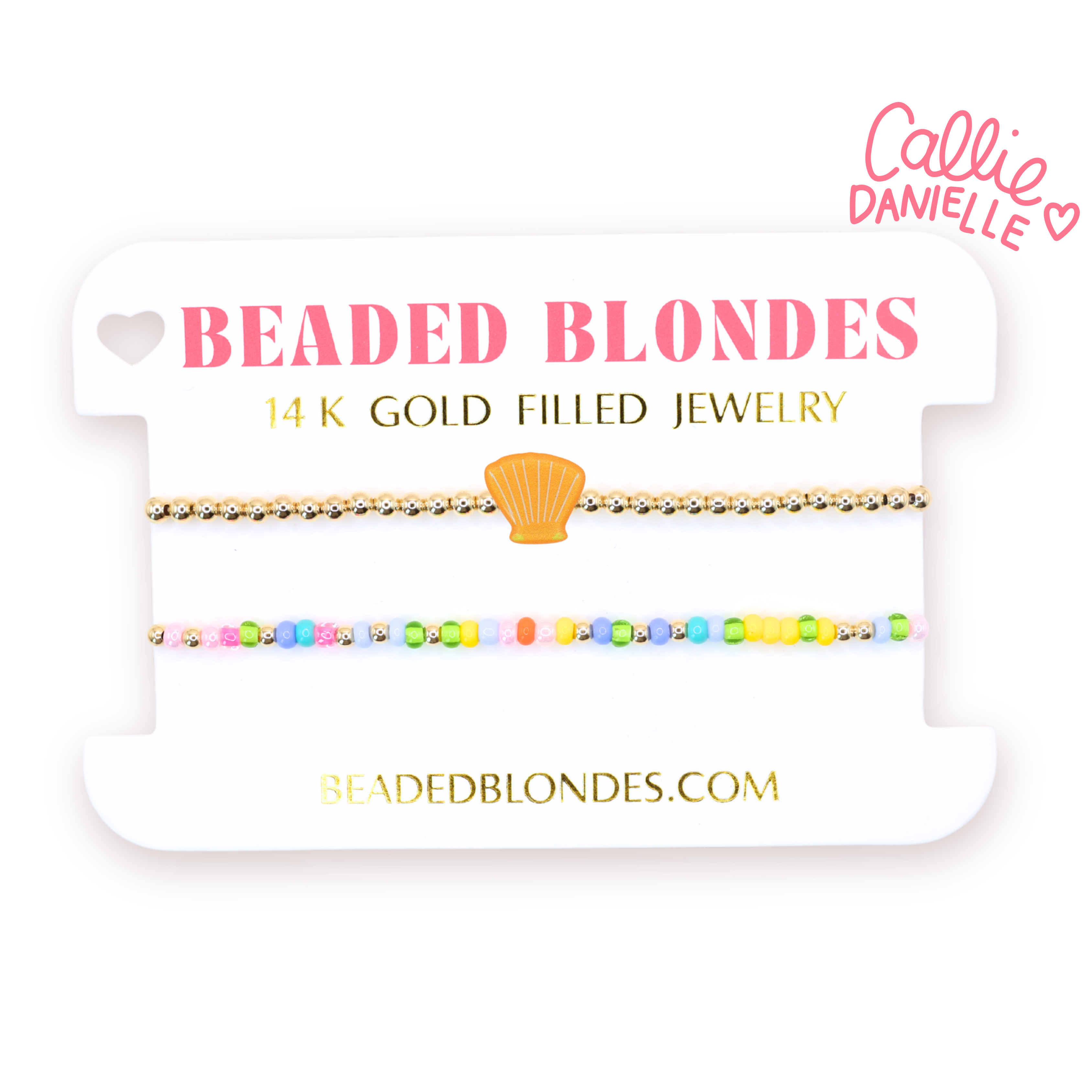 The orange shell bracelet Stack of 2 is part of the exclusive Beaded Blondes x Callie Danielle collection. Featuring an acrylic bead hand-drawn by Callie herself, it’s a vibrant reminder to spread positivity and sunshine wherever you go. This bracelet is waterproof, beachproof, and sweatproof—making it the perfect accessory for everyday wear!