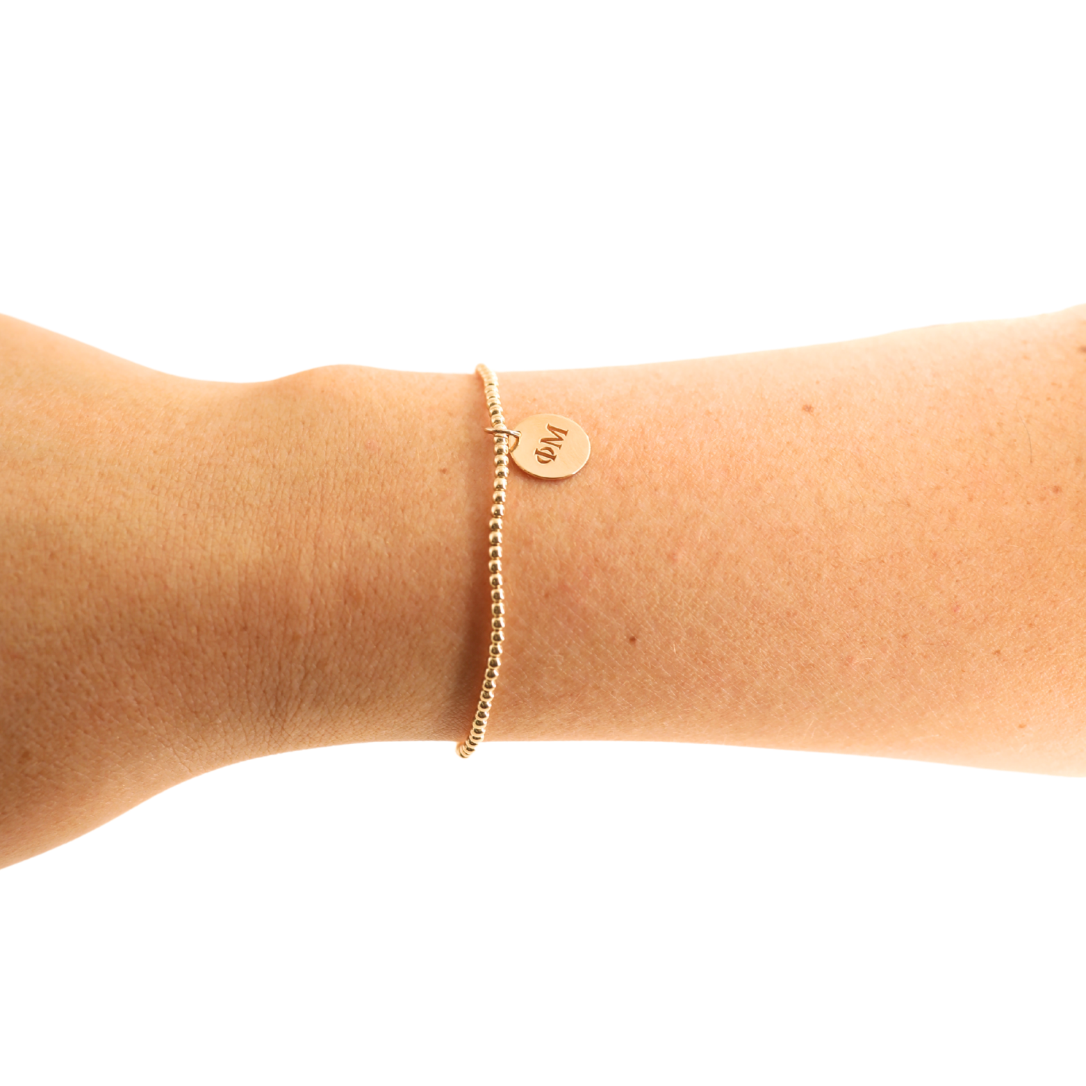 - 2MM gold stackable beaded bracelet with sorority charm.