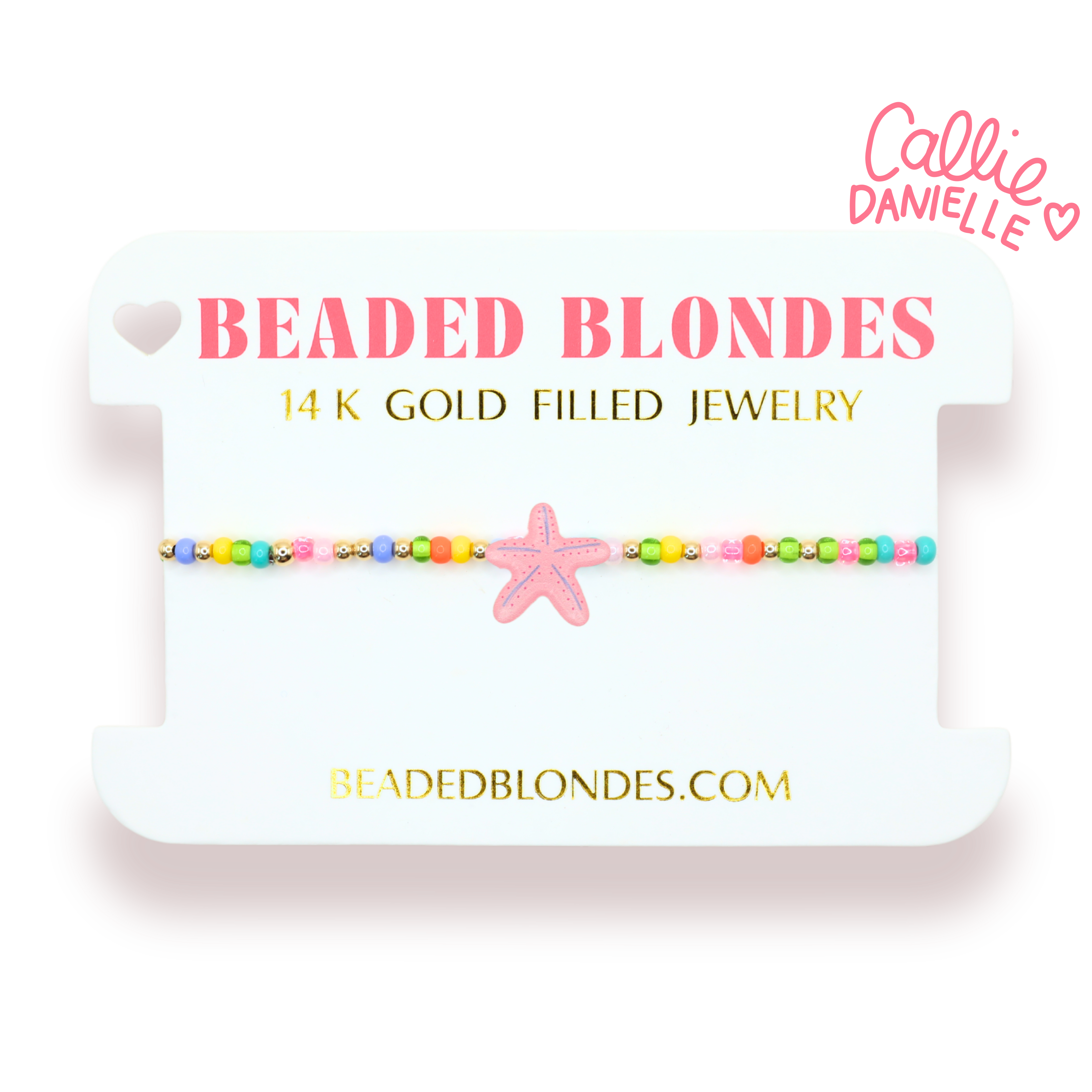 Pink Starfish bracelet is part of the exclusive Beaded Blondes x Callie Danielle collection. Featuring an acrylic bead hand-drawn by Callie herself, it’s a vibrant reminder to spread positivity and sunshine wherever you go. This bracelet is waterproof, beachproof, and sweatproof—making it the perfect accessory for everyday wear!