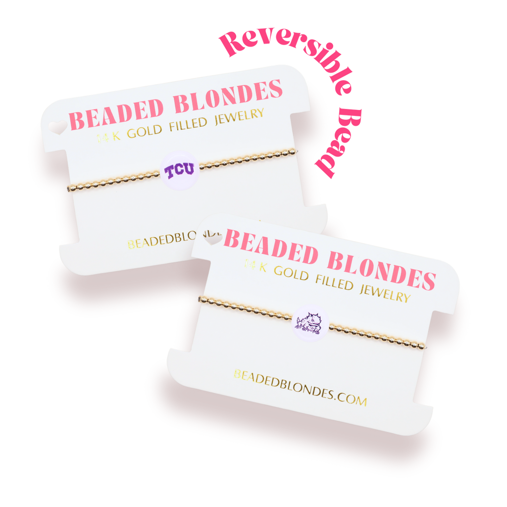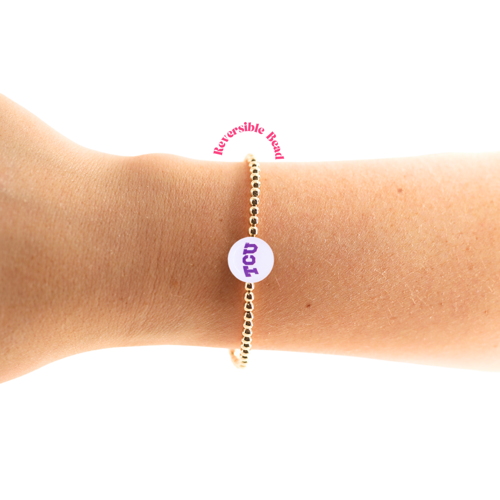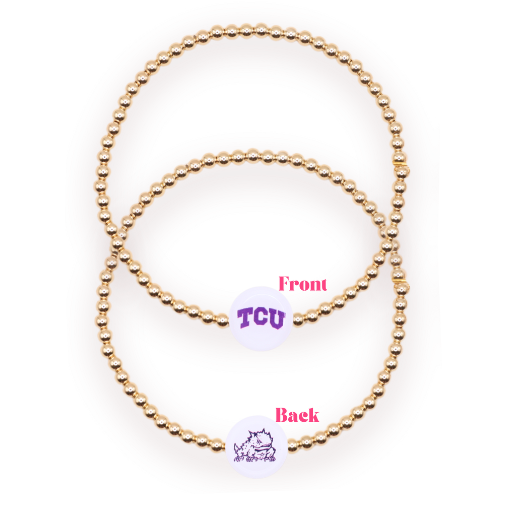 • 3MM gold beaded stretch bracelet with an acrylic team bead that will not fade.