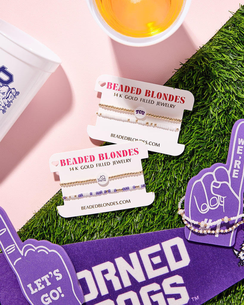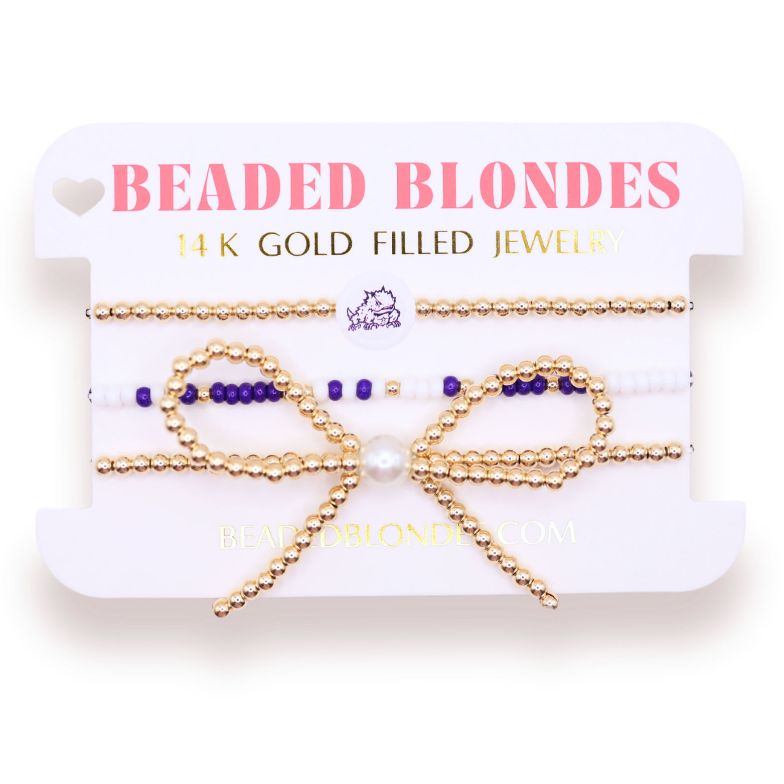 The cutest game day stack featuring our bow bracelet, team bb bead & game day color sprinkle!