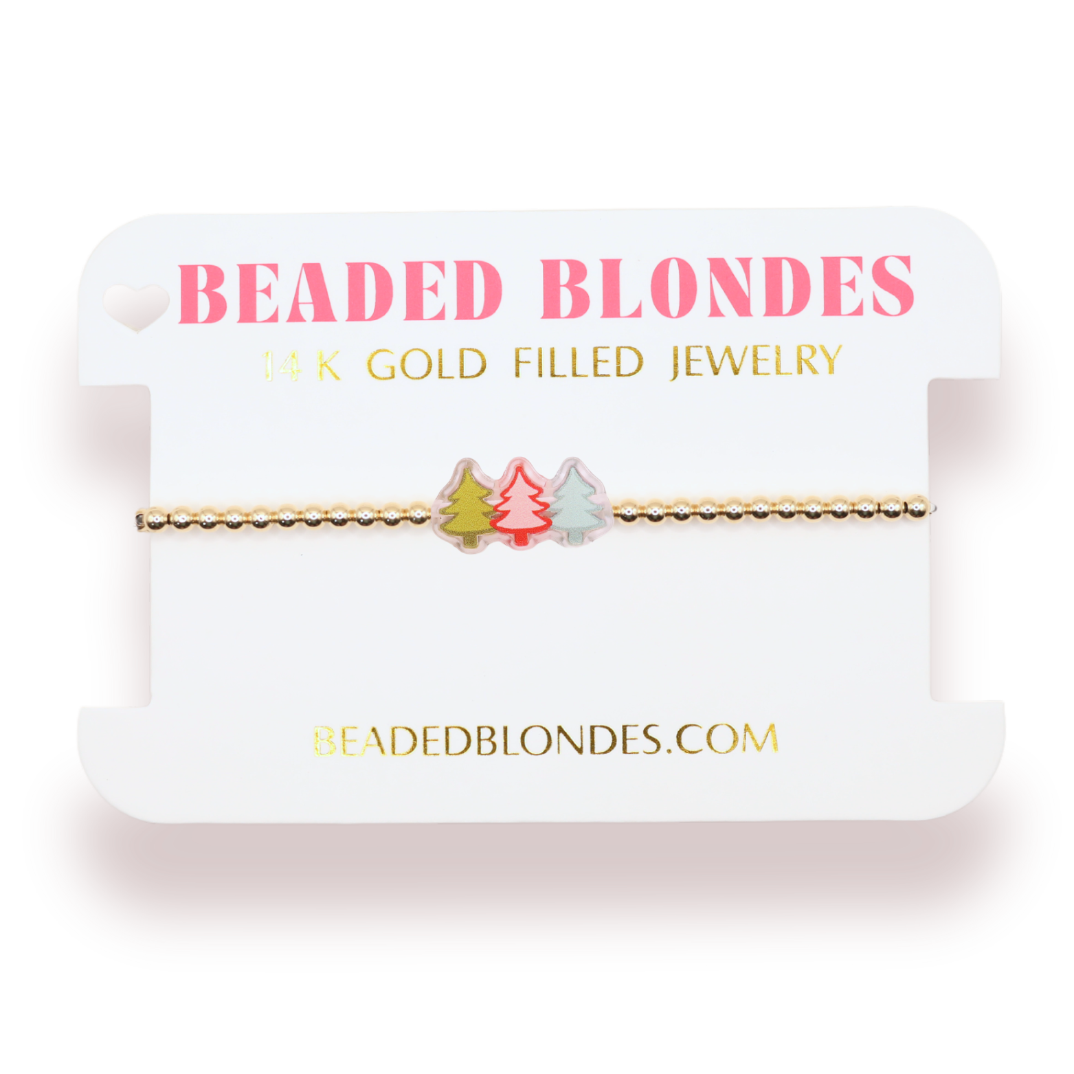 Part of the Beaded Blondes Holiday Collection. Our Tree Trio Holiday Bracelet is on gold making it perfect to add to your stack for the holidays.