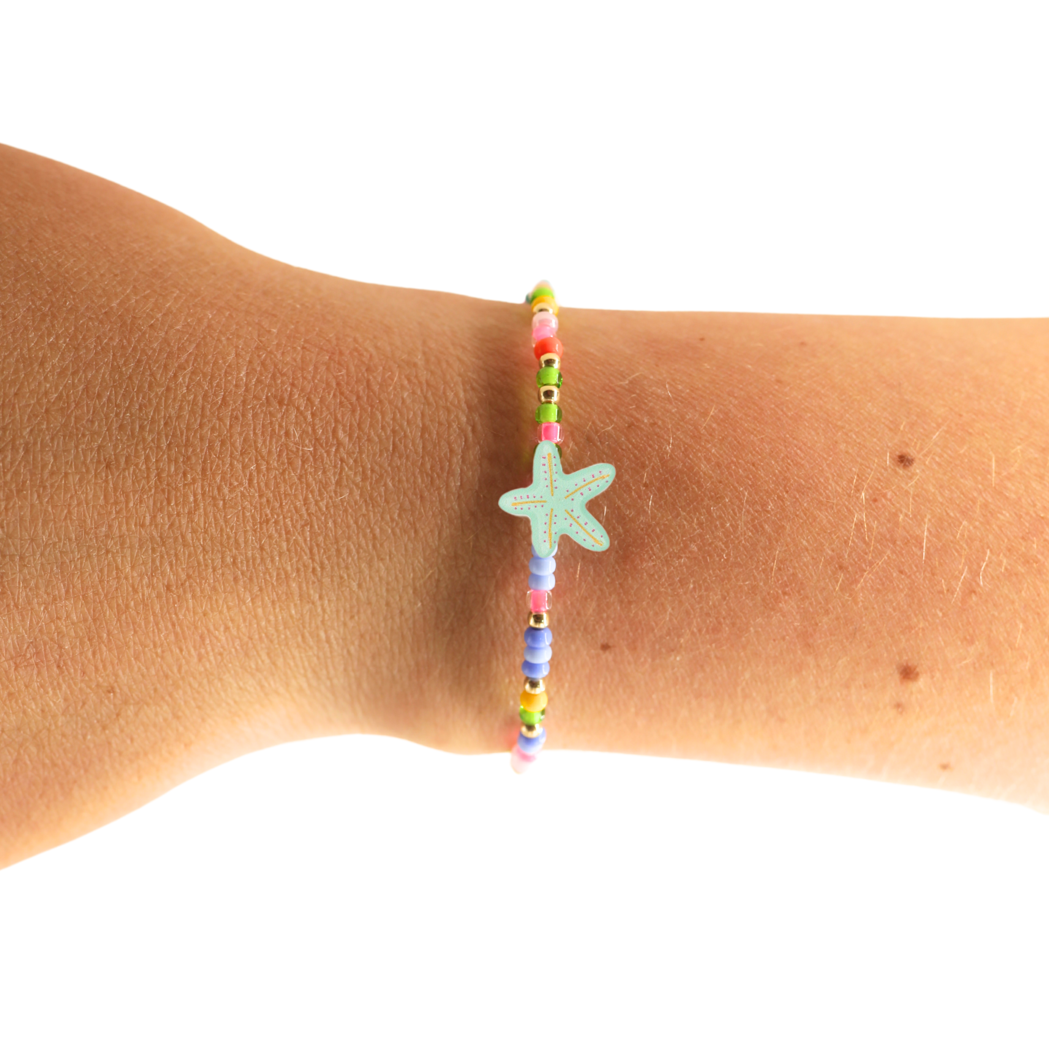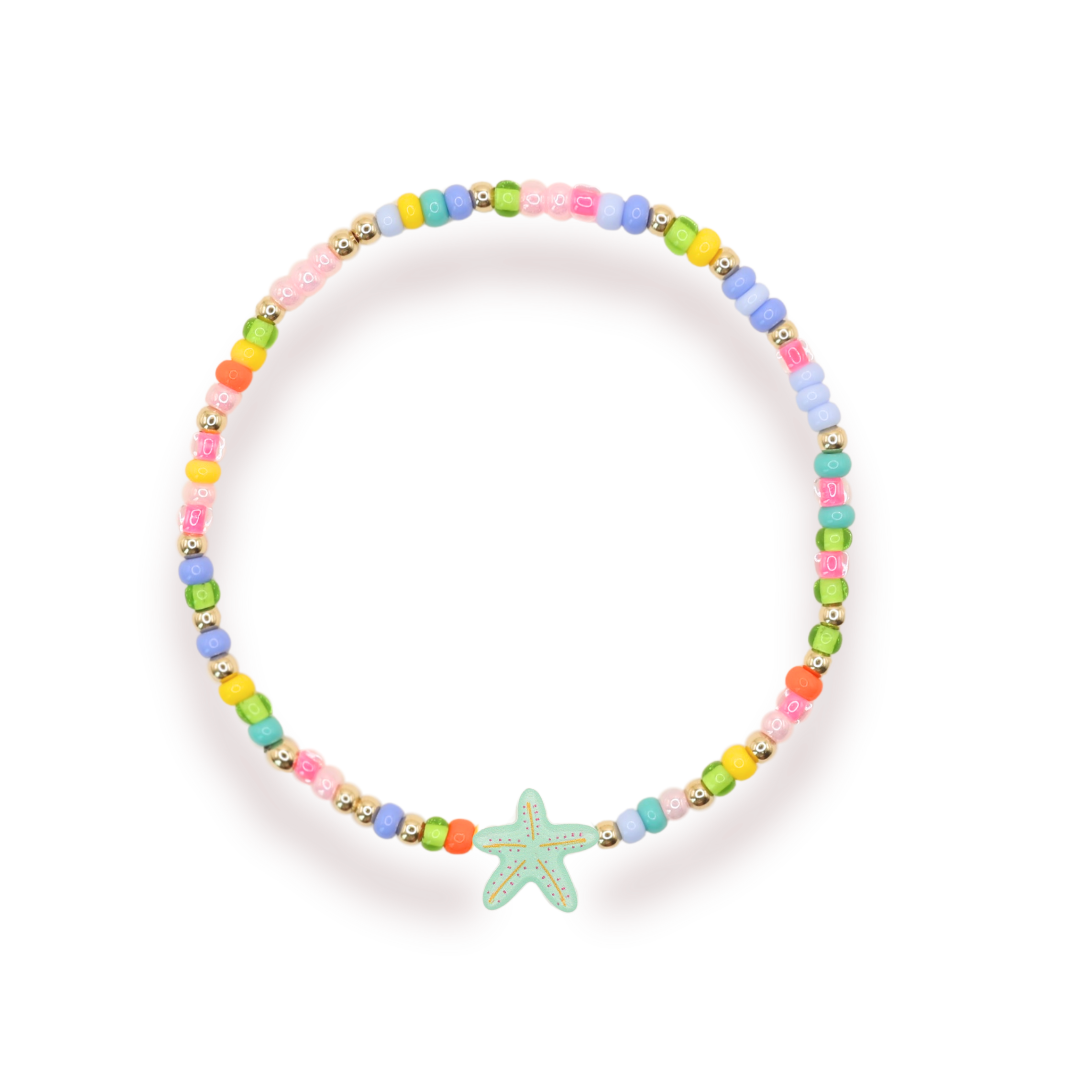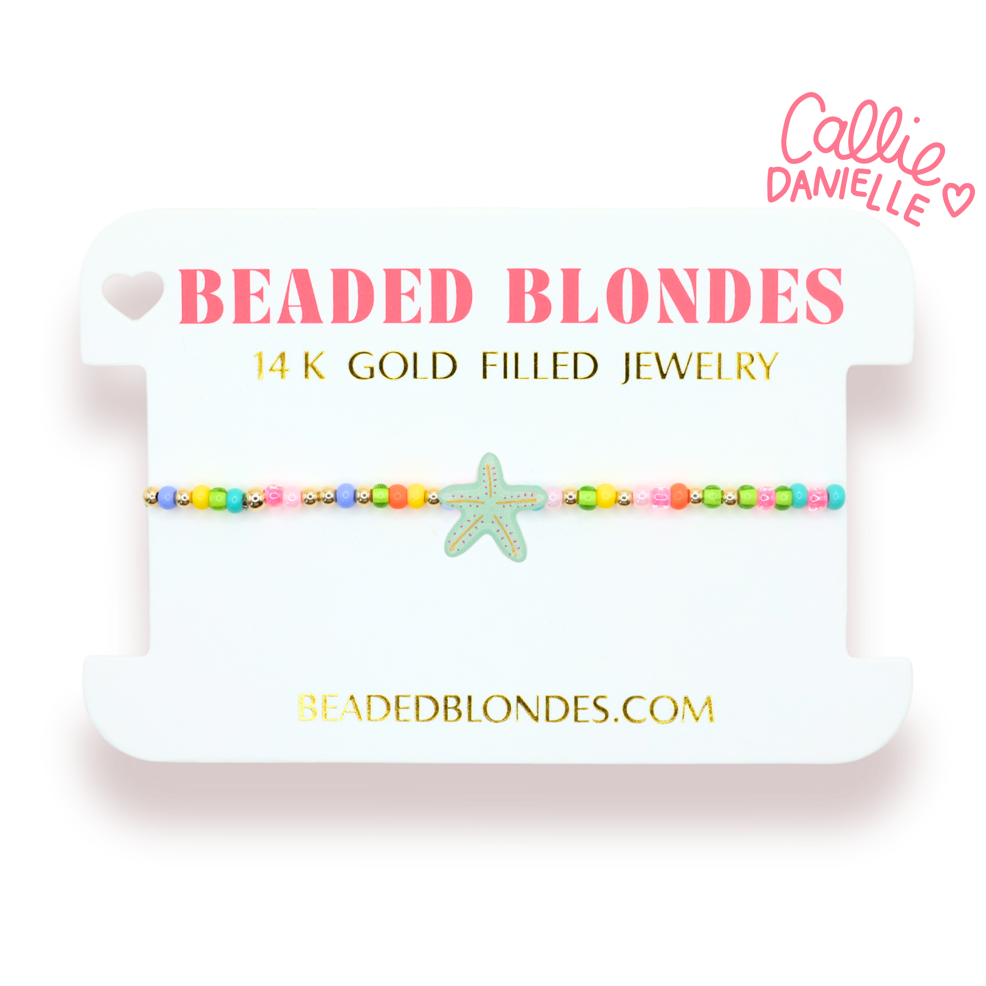 Turquoise Starfish bracelet is part of the exclusive Beaded Blondes x Callie Danielle collection. Featuring an acrylic bead hand-drawn by Callie herself, it’s a vibrant reminder to spread positivity and sunshine wherever you go. This bracelet is waterproof, beachproof, and sweatproof—making it the perfect accessory for everyday wear!