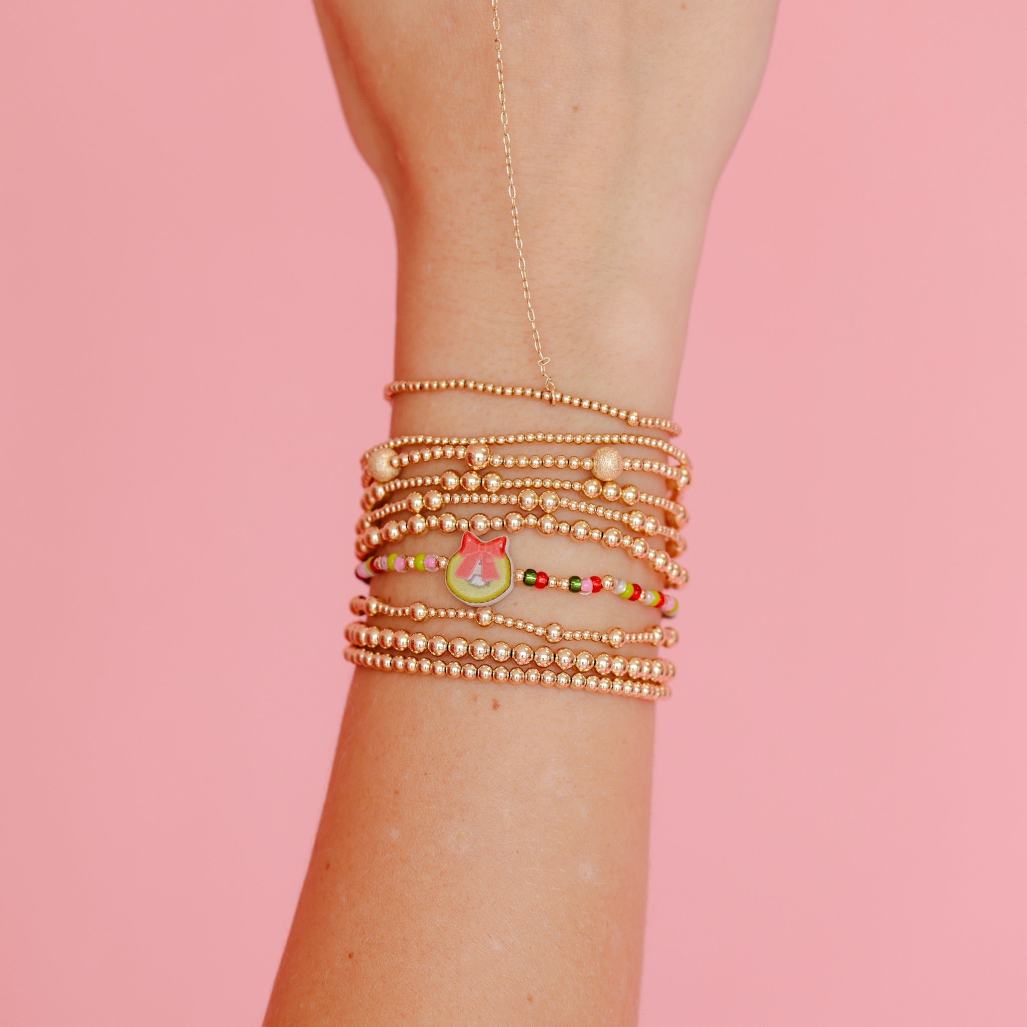 The wreath sprinkle bracelet is a mix of 2.5mm & czech glass beads. The pattern varies on each bracelet making it unique. Includes our signature BB Bead that has a wreath. Kids Size 5.5 inch.