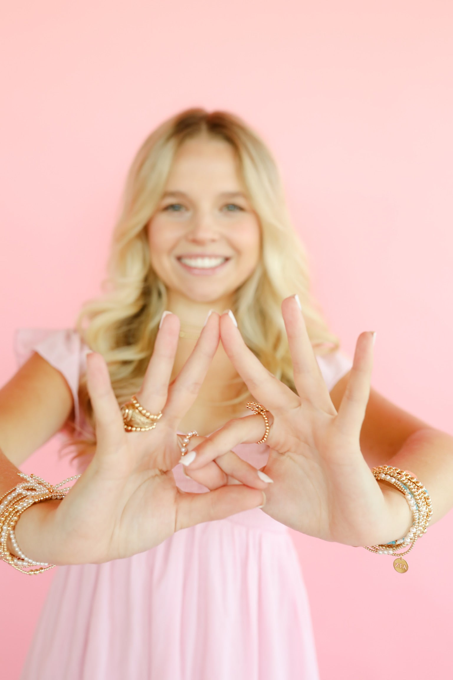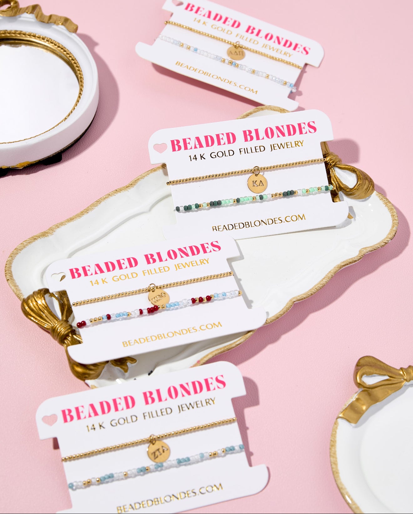 - 2MM gold stackable beaded bracelet with sorority charm.