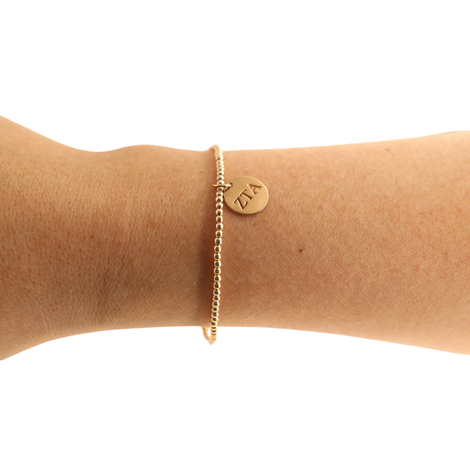 - 2MM gold stackable beaded bracelet with sorority charm.